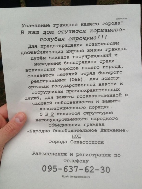 Η προκήρυξη που καλεί τους ρωσικής καταγωγής πολίτες της Σεβαστούπολης να καταταγούν στην πολιτοφυλακή. Έχει και τηλέφωνο επικοινωνίας…