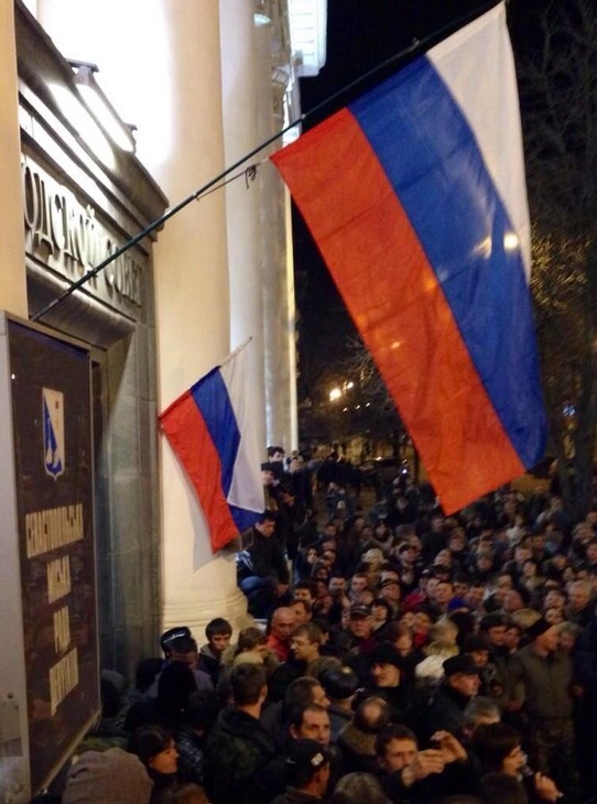 Όπως μπορείτε να δείτε στη φωτογραφία που βρήκαμε στο twitter, στο Δημαρχείο της Σεβαστούπολης, στην Κριμαία, ήδη κυματίζει η ρωσική σημαία ενώ χιλιάδες πολίτες, ρωσικής καταγωγής, διαδηλώνουν την ένωσή τους με τη “μητέρα Ρωσία”.