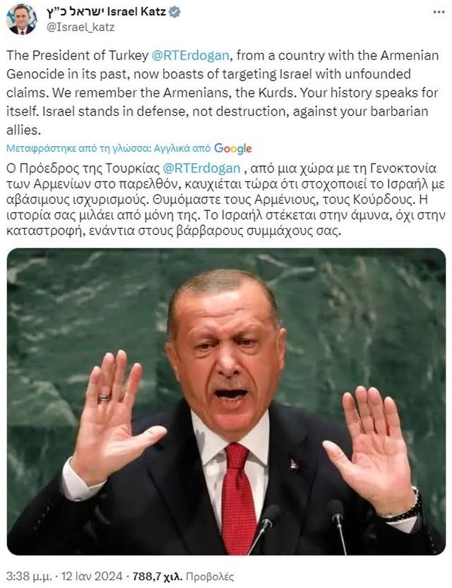 «Ο Ερντογάν, από μια χώρα με τη Γενοκτονία των Αρμενίων στο παρελθόν, καυχιέται τώρα ότι στοχοποιεί το Ισραήλ με αβάσιμους ισχυρισμούς», είπε ο Κατζ.