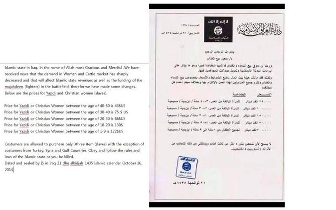 Η ανακοίνωση – τιμοκατάλογος που αναφέρει πόσο κοστίζουν οι σκλάβες – αιχμάλωτες Γιαζίντι ή χριστιανές είναι η ακόλουθη και αναρτήθηκε στο Twitter: