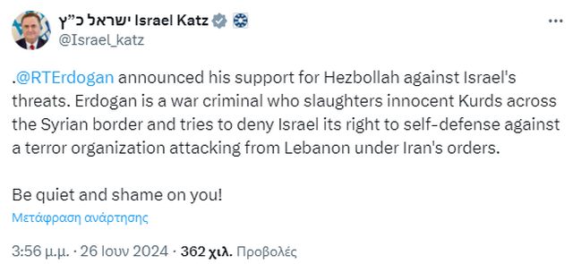 Ο Ισραέλ Κατζ πέρασε στην αντεπίθεση χαρακτηρίζοντάς τον Τούρκο πρόεδρο εγκληματία πολέμου.