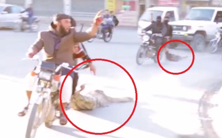 Το Ισλαμικό Κράτος έπιασε τρεις στρατιώτες της Συρίας, τους παρέδωσε σε δημόσιο λιντσάρισμα και στη συνέχεια έδεσε τα άψυχα κορμιά τους πίσω από μηχανάκια και τα έσερνε μέσα στην πόλη της Ράκα, στη Συρία, διαπομπεύοντας τους νεκρούς.