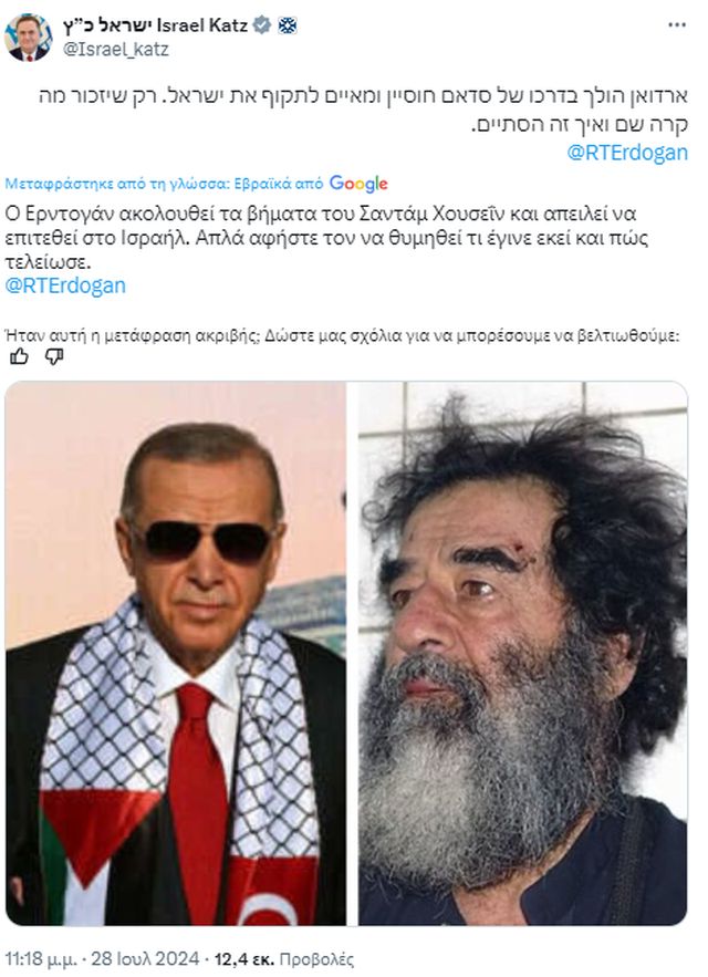 Με μια ανάρτηση στο «Χ» ο Ισραηλινός υπουργός Εξωτερικών, Ίσραελ Κατζ, απάντησε στον Ρετζέπ Ταγίπ Ερντογάν ο οποίος νωρίτερα απειλούσε ότι αν χρειαστεί η Τουρκία θα εισβάλει στο Ισραήλ.