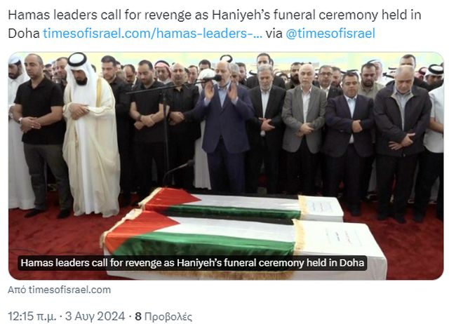 Επικήδεια τελετή για τον ηγέτη της Χαμάς Ισμαήλ Χανίγιε πραγματοποιήθηκε την Παρασκευή 2/8 στο Κατάρ μετά τη εξολόθρευσή του πριν από δύο ημέρες στην ιρανική πρωτεύουσα Τεχεράνη – μία από μια σειρά εκτελέσεων υψηλόβαθμων αξιωματούχων της παλαιστινιακής τρομοκρατικής οργάνωσης καθώς μαίνεται ο πόλεμος ανάμεσα στο Ισραήλ και τη Χαμάς στη Γάζα.