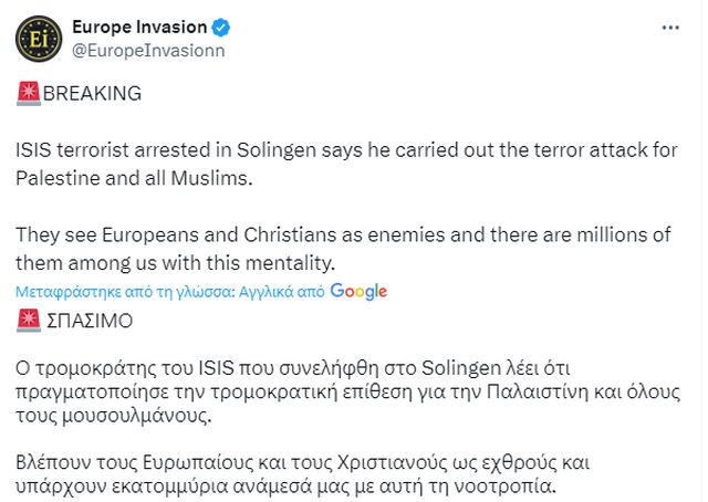 Νωρίτερα ο Χέντρικ Βιστ, ο πρωθυπουργός του κρατιδίου της Βόρειας Ρηνανίας-Βεστφαλίας, δήλωσε ότι η επίθεση με μαχαίρι κατά την οποία τρεις άνθρωποι έχασαν τη ζωή τους και άλλοι οκτώ τραυματίστηκαν στην πόλη Ζόλινγκεν της δυτικής Γερμανίας ήταν «τρομοκρατική ενέργεια».