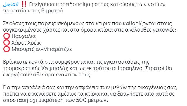 Ο Αβισάι Αντρέι, ο αραβόφωνος εκπρόσωπος των Ισραηλινών Αμυντικών Δυνάμεων (IDF), δημοσίευσε χάρτες μαζί με την ανακοίνωση, καλώντας τους πολίτες να απομακρυνθούν τουλάχιστον 500 μέτρα από τις τρεις τοποθεσίες.
