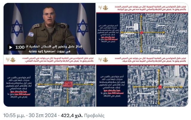 Ο Ισραηλινός Στρατός κάλεσε τους Λιβανέζους αμάχους κοντά σε πολλά κτίρια στα νότια προάστια της Βηρυτού, σε ένα προπύργιο της Χεζμπολάχ γνωστό ως Νταχιγιέ, να απομακρυνθούν άμεσα.