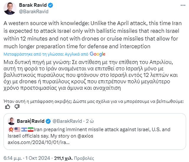 Το Ιράν αναμένεται να επιτεθεί στο Ισραήλ με βαλλιστικούς πυραύλους που μπορούν να φτάσουν στόχους εντός 12 λεπτών και όχι με μη επανδρωμένα αεροσκάφη ή πυραύλους Κρουζ που χρειάζονται περισσότερο χρόνο, δήλωσε δημοσιογράφος του Axios την Τρίτη στο «X», επικαλούμενος δυτική πηγή.