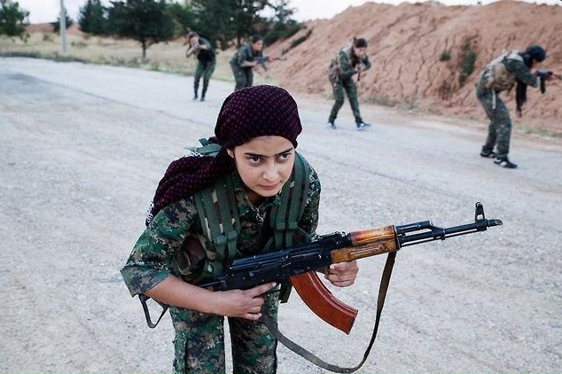 Στις φωτογραφίες που αναρτήθηκαν από κουρδικά ειδησεογραφικά Μέσα στο Twitter βλέπετε τα κορίτσια να εκπαιδεύονται για πόλεμο.