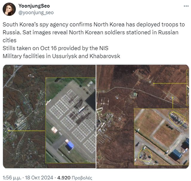 Η υπηρεσία Πληροφοριών της Νότιας Κορέας «αντιλήφθηκε από τις 8 έως τις 13 (Οκτωβρίου) ότι η Βόρεια Κορέα μετέφερε τις ειδικές της δυνάμεις στη Ρωσία σε μεταγωγικό πλοίο του ρωσικού ναυτικού, επιβεβαιώνοντας την έναρξη της στρατιωτικής ανάμειξης της Βόρειας Κορέας» στον πόλεμο της Ουκρανίας, ανέφερε σε ανακοίνωση, δημοσιεύοντας λεπτομερείς δορυφορικές εικόνες.