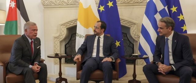 Ο πρόεδρος της Κυπριακής Δημοκρατίας Νίκος Χριστοδουλίδης υποδέχθηκε την Τετάρτη 27/11, στο Προεδρικό Μέγαρο στη Λευκωσία, τον βασιλιά της Ιορδανίας Αμπντάλλα Β’ και τον πρωθυπουργό της Ελλάδας Κυριάκο Μητσοτάκη, οι οποίοι, επικεφαλής των αντιπροσωπειών τους παρακάθησαν σε γεύμα εργασίας στο πλαίσιο της 4ης κατά σειρά Τριμερούς Συνάντησης Κορυφής Ελλάδας – Κύπρου – Ιορδανίας.