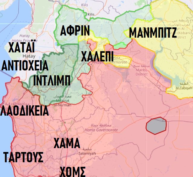 Με κόκκινο τα εδάφη που ελέγχει η συριακή κυβέρνηση, με πράσινο τα εδάφη που τελούν υπό τουρκική κατοχή με τη βοήθεια των τζιχαντιστών, με κίτρινο τα εδάφη που ελέγχουν οι Κούρδοι