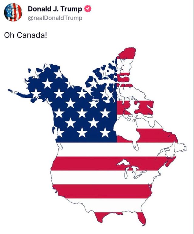 Μέσω της πλατφόρμας κοινωνικής δικτύωσης Truth Social, ο Τραμπ ανάρτησε δύο εικόνες: μία που δείχνει τις ΗΠΑ και τον Καναδά ενωμένες υπό την ένδειξη «Ηνωμένες Πολιτείες» και μία άλλη όπου οι δύο χώρες καλύπτονται με την αμερικανική σημαία. Σε μία από τις αναρτήσεις έγραψε: «Ω Καναδά!».