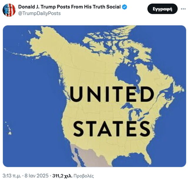 Ο εκλεγμένος πρόεδρος των Ηνωμένων Πολιτειών, Ντόναλντ Τραμπ, επανέλαβε την Τρίτη 07/01/25 την πρότασή του για την ένταξη του Καναδά ως 51ης πολιτείας των ΗΠΑ, δημοσιεύοντας χάρτες που παρουσιάζουν τη γειτονική χώρα ως μέρος της Αμερικής.