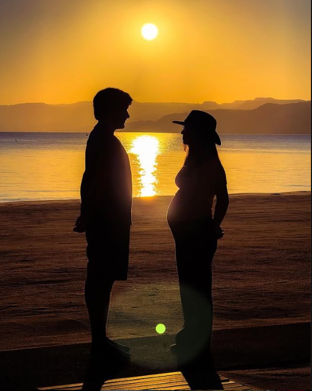 Στη φωτογραφία, η πριγκίπισσα Ιμάν και ο ελληνικής καταγωγής σύζυγός της, Δημήτρης (Τζαμίλ) Αλέξανδρος Θερμιώτης, ποζάρουν σε παραλία κατά το ηλιοβασίλεμα, με τη φουσκωμένη κοιλιά της πριγκίπισσας να είναι εμφανής.