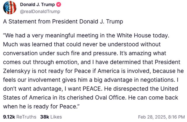 »Έχω καταλήξει στο συμπέρασμα ότι ο Πρόεδρος Ζελένσκι δεν είναι έτοιμος για ειρήνη, εφόσον εμπλέκεται η Αμερική, καθώς θεωρεί ότι η παρουσία μας του προσφέρει μεγάλο πλεονέκτημα στις διαπραγματεύσεις. Δεν επιδιώκω πλεονέκτημα – επιδιώκω ΕΙΡΗΝΗ.