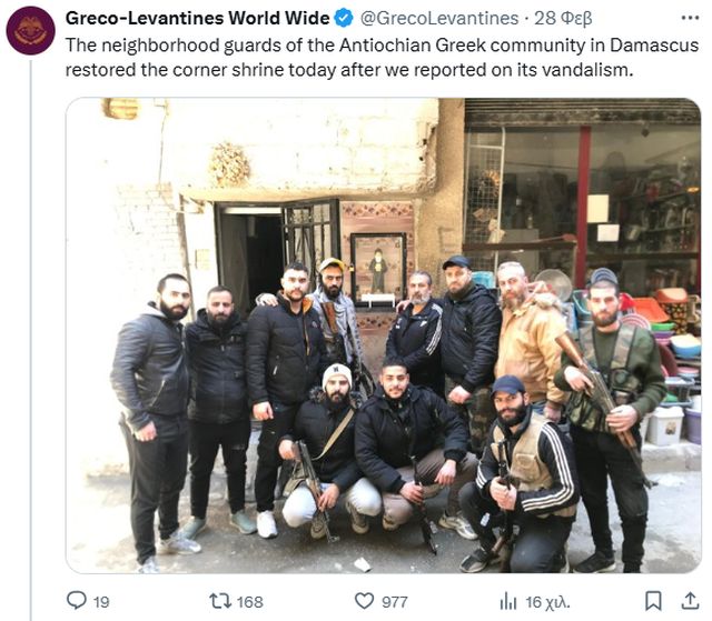 Με ανάρτησή τους στο «Χ» οι Ελληνορθόδοξοι της Συρίας ρωτάνε την ελληνική κυβέρνηση, δηλαδή την κυβέρνηση Μητσοτάκη, ποιος θα τους προστατεύσει από τους τζιχαντιστές.