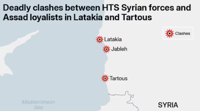 Σφοδρές συγκρούσεις ξέσπασαν στη βορειοδυτική Συρία, στην επαρχία Λαττάκεια (Λαοδίκεια), μεταξύ των δυνάμεων ασφαλείας της νέας de facto ισλαμιστικής κυβέρνησης και ενόπλων πιστών στον ανατραπέντα πρόεδρο Μπασάρ αλ Άσαντ, με αποτέλεσμα τον θάνατο περισσότερων από 70 ανθρώπων, σύμφωνα με το Συριακό Παρατηρητήριο Ανθρωπίνων Δικαιωμάτων.