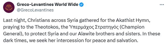 «Χθες το βράδυ, Χριστιανοί σε όλη τη Συρία συγκεντρώθηκαν για τον Ακάθιστο Ύμνο, προσευχόμενοι στην Θεοτόκο, την Ὑπερμάχο Στρατηγό, να προστατεύσει τη Συρία και τους Αλαουίτες αδελφούς και αδελφές μας. Σε αυτούς τους σκοτεινούς καιρούς, ζητάμε τη μεσιτεία της για ειρήνη και σωτηρία».