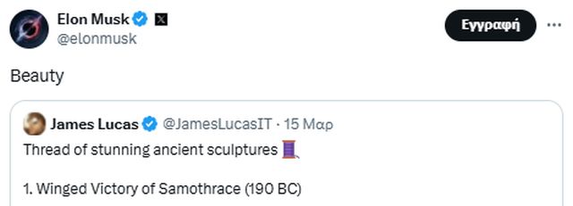 Ο Έλον Μασκ αναδημοσίευσε στο «X» (Twitter) μια ανάρτηση που περιλάμβανε φωτογραφία του αγάλματος της Νίκης της Σαμοθράκης, εκφράζοντας με μία λέξη τον θαυμασμό του.