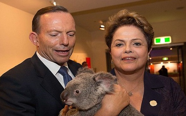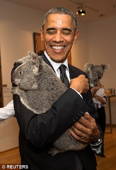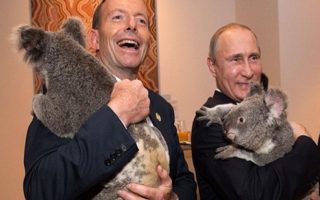 Έτσι ο Μπαράκ Ομπάμα, ο Βλαντιμίρ Πούτιν, ο Καναδός Στίβεν Χάρπερ, η Βραζιλιάν Ντίλμα Ρούσεφ και άλλοι αγκάλιασαν ένα χνουδωτό κοάλα, προκειμένου να ξεκινήσουν με ηρεμία τις απαιτητικές συνομιλίες γύρω από την παγκόσμια οικονομία, την επιδημία του Έμπολα, την ουκρανική κρίση.