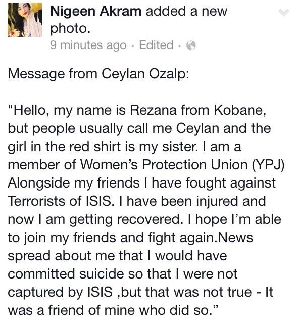 Με ένα συγκινητικό μήνυμα η Κούρδισσα αντάρτισσα Σεϊλάν Οζάλπ (Ceylan Ozalp) απευθύνθηκε σε όσους τη θεωρούσαν σκοτωμένη.