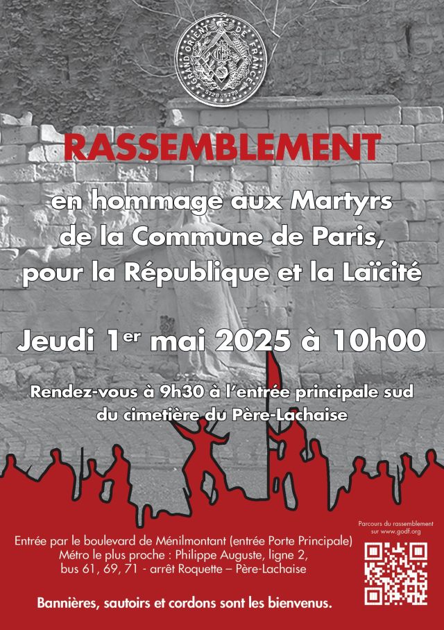 Η παρουσία όσων παρευρεθούν σε αυτή την εκδήλωση θα τιμήσει τη μνήμη των αγωνιστών της Κομμούνας και θα ενισχύσει τη διαρκή δέσμευση της Μεγάλης Ανατολής της Γαλλίας στις αρχές της Δημοκρατίας και της Λαϊκότητας.