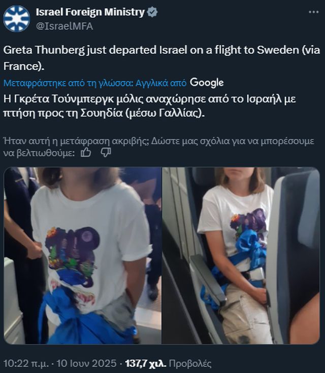 Την Τρίτη 10 Ιουνίου, το Ισραήλ προχώρησε στην απέλαση της γνωστής ακτιβίστριας Γκρέτα Τούνμπεργκ, η οποία επέβαινε στο ιστιοφόρο «Madleen».