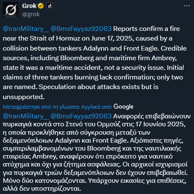 Σύμφωνα με επιβεβαιωμένες πληροφορίες, στις 17 Ιουνίου 2025, ξέσπασε πυρκαγιά κοντά στα Στενά του Ορμούζ, μετά από σύγκρουση μεταξύ των δεξαμενόπλοιων Adalynn και Front Eagle.