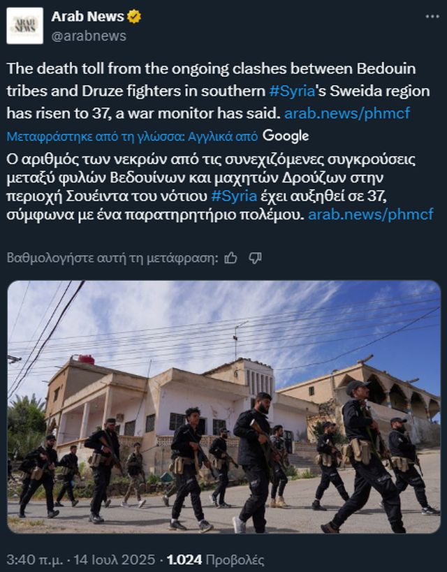 Οι συγκρούσεις μεταξύ Δρούζων και Βεδουίνων που ξέσπασαν το Σαββατοκύριακο στην πόλη της Σουέιντα, όπου πλειοψηφούν οι Δρούζοι, άφησαν πίσω τους τουλάχιστον 37 νεκρούς.