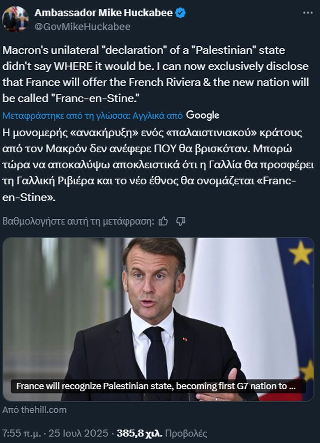Ο Αμερικανός Πρεσβευτής στο Ισραήλ, Μάικ Χακάμπι, επέκρινε τη δήλωση του Γάλλου Προέδρου Εμανουέλ Μακρόν ότι η Γαλλία θα αναγνωρίσει ένα παλαιστινιακό κράτος, καλώντας τη Γαλλία να παραχωρήσει δικό της έδαφος για τη δημιουργία του, χωρίς να διευκρινίζει πού θα μπορούσε να ιδρυθεί.