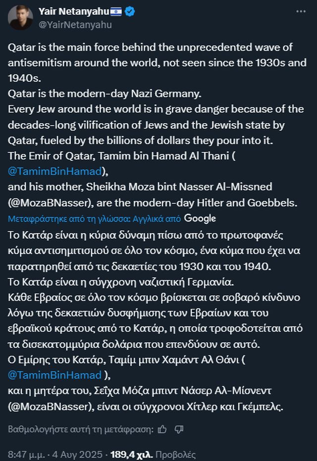 Ο Γιαΐρ Νετανιάχου, γιος του πρωθυπουργού της Ισραήλ, Μπενιαμίν Νετανιάχου, κατηγόρησε το Κατάρ ότι τροφοδοτεί τον παγκόσμιο αντισημιτισμό σε ανάρτησή του στην πλατφόρμα X/Twitter τη Δευτέρα 04/08.