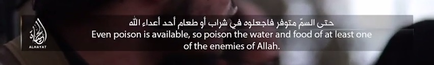 Καλεί, ακόμα, να δηλητηριάσουν οι μουσουλμάνοι το νερό και τις τροφές στη Γαλλία: “Εάν υπάρχει δηλητήριο διαθέσιμο, δηλητηριάστε το νερό και τις τροφές τουλάχιστον ενός εχθρού του Αλλάχ”.