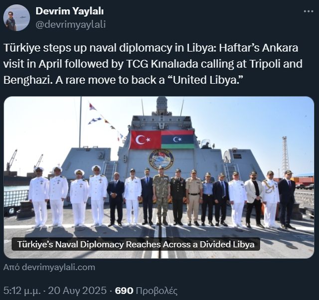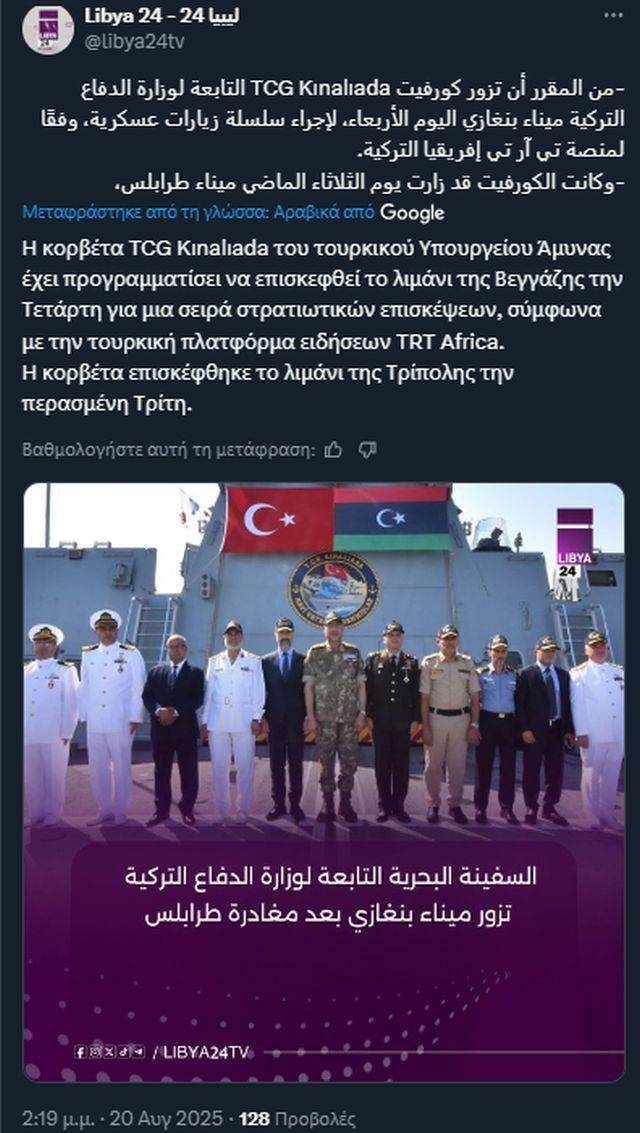 »Στις 20–21 Αυγούστου 2025, το TCG Κιναλιαντά συνέχισε ανατολικά για επίσκεψη στο λιμάνι της Βεγγάζης, το προπύργιο του Χαφτάρ.