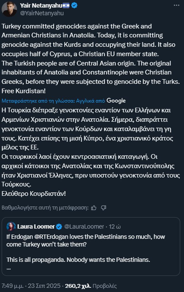 Ο γιος του Ισραηλινού ηγέτη έχει επανειλημμένα στο παρελθόν επιτεθεί ευθέως στην Τουρκία, υπερασπίζοντας με πάθος τα ιστορικά δίκαια της Ελλάδας και φωτίζοντας ζητήματα όπως η κατοχή εδαφών και οι γεωπολιτικές συγκρούσεις στην περιοχή.