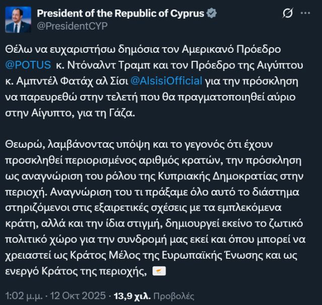 Ο Πρόεδρος της Κυπριακής Δημοκρατίας Νίκος Χριστοδουλίδης, σε ανάρτησή του στο «Χ», ευχαρίστησε δημόσια τον Αμερικανό Πρόεδρο κ. Ντόναλντ Τραμπ και τον Πρόεδρο της Αιγύπτου κ. Αμπντέλ Φατάχ αλ Σίσι για την πρόσκληση να παρευρεθεί στην τελετή που θα πραγματοποιηθεί τη Δευτέρα 13/10 στην Αίγυπτο, για τη Γάζα.