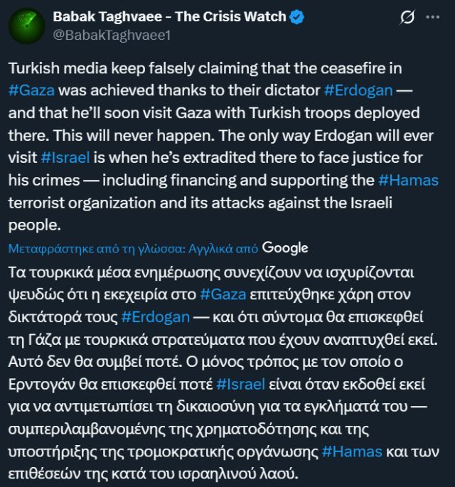 Ο αμυντικός συντάκτης Μπαμπάκ Ταγκβαΐ, σε ανάρτηση του στο «Χ», αναφέρει ότι τα τουρκικά Μέσα ενημέρωσης συνεχίζουν να ισχυρίζονται ψευδώς πως η εκεχειρία στη Γάζα επιτεύχθηκε χάρη στον δικτάτορα τους Ερντογάν και ότι σύντομα θα επισκεφθεί τη Γάζα με ανάπτυξη τουρκικών στρατευμάτων εκεί.
