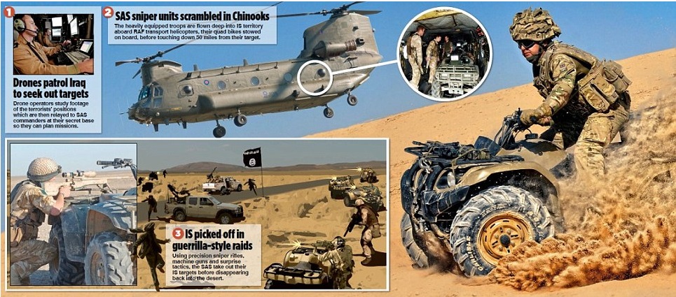 Όπως ισχυρίζεται η βρετανική εφημερίδα, μικρές ομάδες κομάντος αφέθηκαν στα εδάφη που ελέγχει το Ισλαμικό Κράτος με ελικόπτερα Σινούκ της RAF (της Βασιλικής Αεροπορίας).