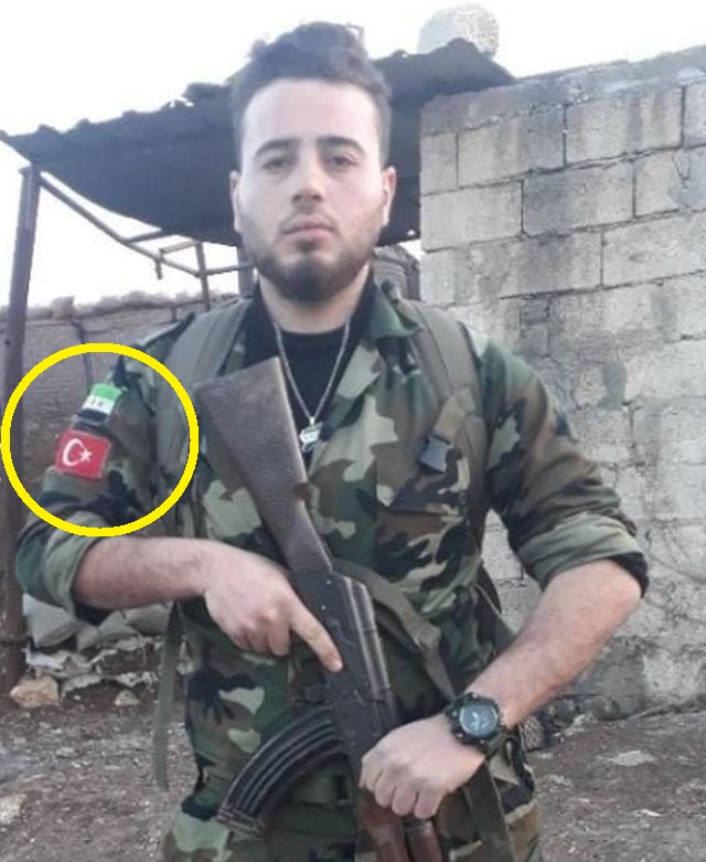 Ο Χάλεντ Μπραχίμ Μαχμούντ που σκοτώθηκε στο Χαλέπι από την κουρδική αντίσταση. Όπως βλέπετε, ο μισθοφόρος τζιχαντιστής φέρει τόσο την τουρκική σημαία όσο και τη σημαία της «νέας Συρίας».