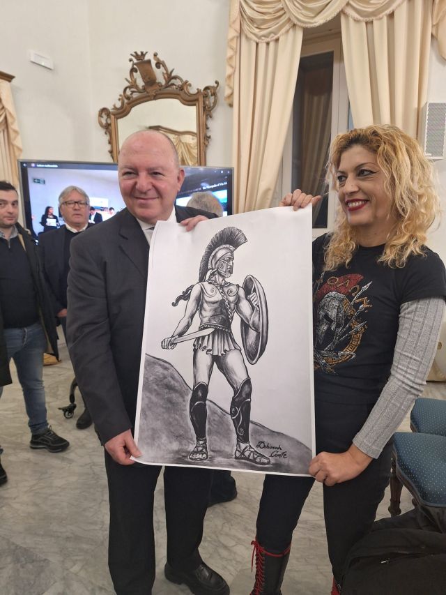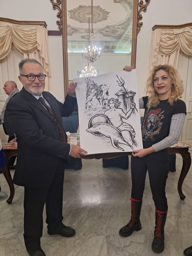 Συγκεκριμένα, η καλλιτέχνις προσέφερε ένα έργο της στον καθηγητή Μάρκο Γκάλντι, πρόεδρο της Ιταλικής Φιλελληνικής Εταιρείας και επίτιμο μέλος του Φιλελληνικού Εντευκτηρίου του Τάραντα.