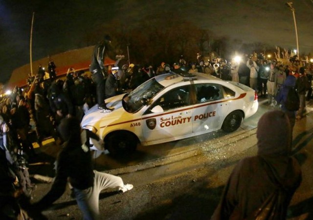 Βομβαρδισμένο τοπίο θυμίζει η πόλη Φέργκιουσον στο Μιζούρι των Ηνωμένων Πολιτειών μετά το χάος που προκλήθηκε από την απόφαση του τοπικού δικαστηρίου να μην προχωρήσει σε δίκη κατά του αστυνομικού που σκότωσε εν ψυχρώ τον 18χρονο Μάικλ Μπράουν.
