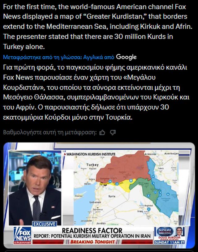 Για πρώτη φορά, το παγκοσμίου φήμης αμερικανικό δίκτυο Fox News προέβαλε χάρτη του «Μεγάλου Κουρδιστάν», τα σύνορα του οποίου εκτείνονται μέχρι τη Μεσόγειο Θάλασσα, συμπεριλαμβάνοντας το Κιρκούκ και το Αφρίν.