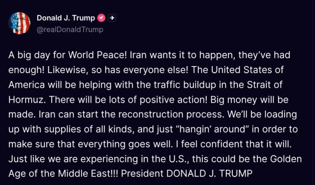 «Το Ιράν επιθυμεί αυτή την εξέλιξη, έχουν κουραστεί πλέον! Το ίδιο ισχύει και για όλους τους υπόλοιπους!» έγραψε ο Τραμπ στην πλατφόρμα Truth Social.